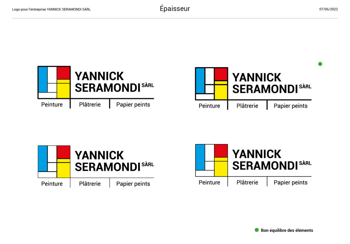 Conception du logo et du set administratif d'une entreprise de peinture en bâtiment située à Versoix avec une forte inspiration à Mondrian (en 2022). Création d'un panneau en aluminium lumineux avec peinture noire sur l'arrière pour faire ressortir le lettrage et ajout des 3 couleurs primaires du logo (en 2025).